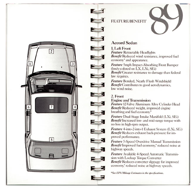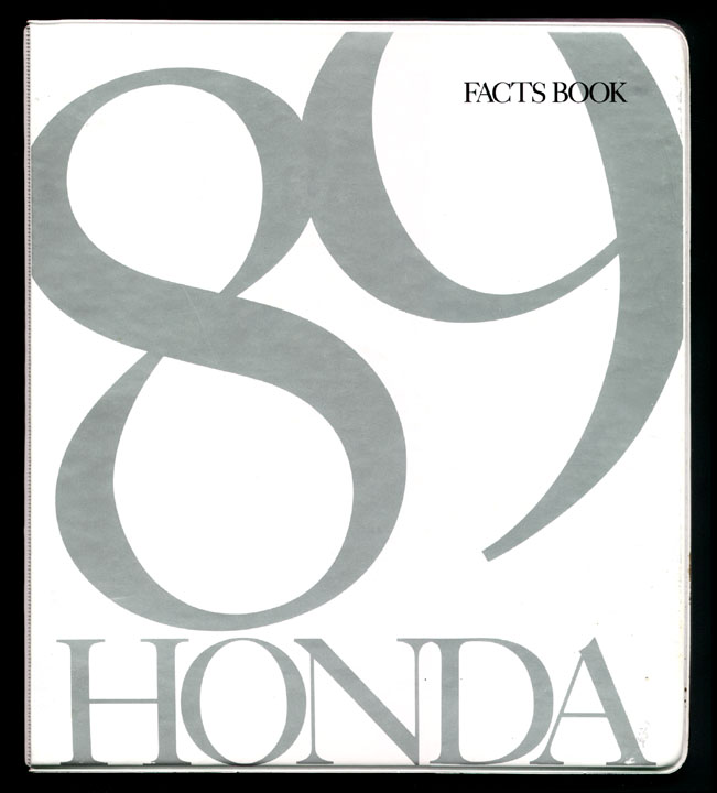 This is a large 3-ring notebook that was given to dealers as a sales and training manual for the 1989 model year Accords. It was divided into nine sections including an Introduction with selling tips; a "Heritage" section featuring the history of Honda; sections on the CRX, Civic, Accord and Prelude; an engineering chapter covering aerodynamics, engine design, suspension and steering, and an Accessories section for all models. This incredible and comprehensive internal reference manual for the '89s is very difficult to find.