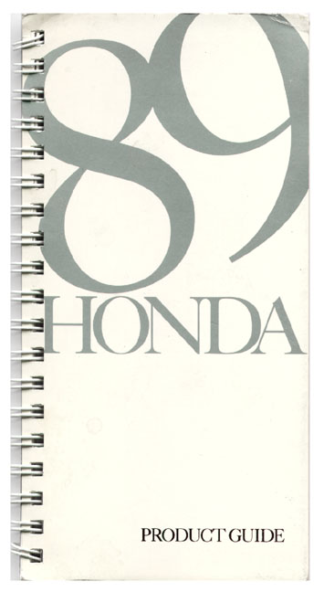 This very scarce pocket-size 126-page Product Guide measures 6-1/2" x 3-1/2" and was designed as a reference guide for salespeople. According to the Introduction page, "This Honda Product Guide is designed to give you a quick, easy-to-read reference for all 1989 Honda models plus market positioning, key fatures and benefits, accessories, specifications, standard equipment and EPA mileage estimates."