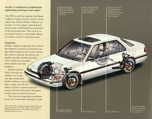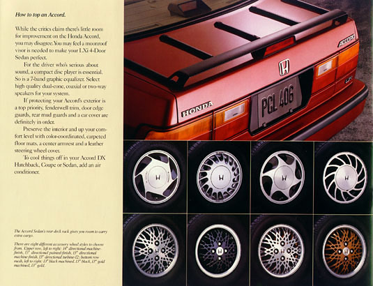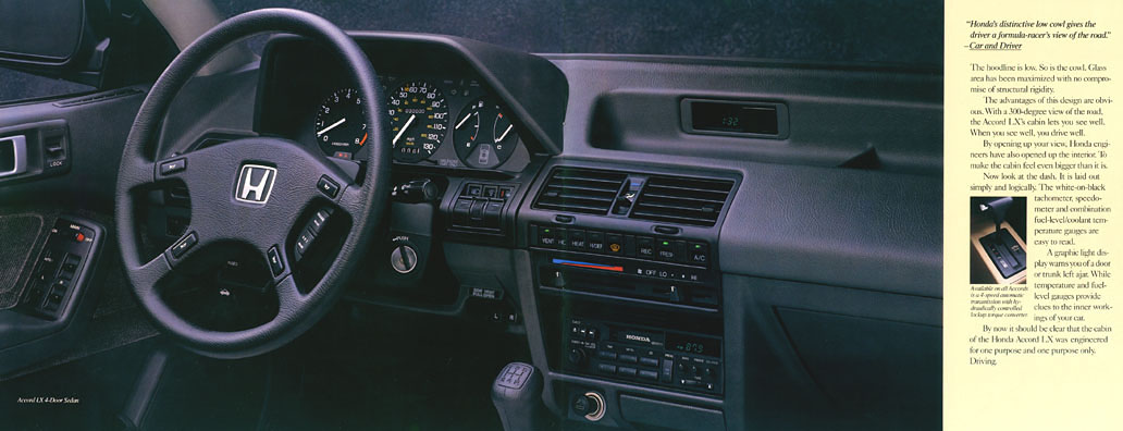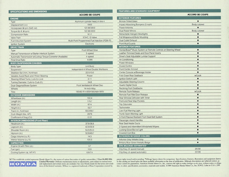 Shown are selected pages from the original 30-page factory brochure for the 1989 Honda Accord. Click on any of the images to enlarge. Original brochures are becoming a popular item for car owners to acquire. As is to be expected, the older the car the more difficult some brochures are to find. I have more scarce 1989 Honda related print materials that I will be adding scans for in the future.