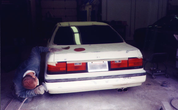 Here are some pictures of my car and its brand new paint job!! Three of the photos show the work in progress at the body shop. As you can see it's much whiter and brighter than before!! You have to realize the old paint on my car was 11 years old and it was faded in places, paint was chipping off, it looked pretty bad. Now, it's a beautiful car to look at. In fact, it's so bright it nearly blinds me to look at it! What a difference from before and after.